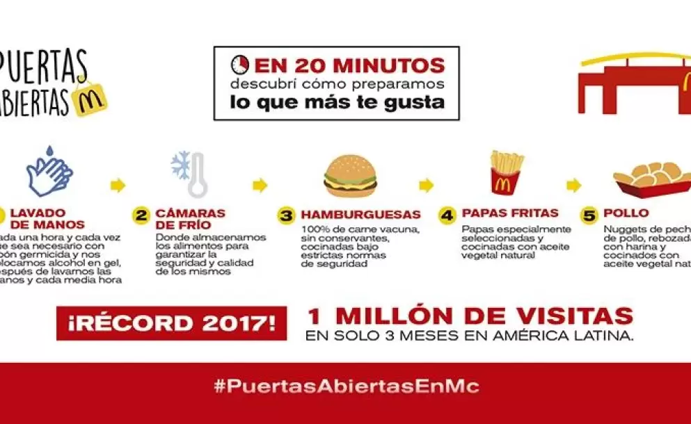 A través de Puertas Abiertas, McDonald's muestra la transparencia con la que elabora su comida y, de esta forma, erradica los mitos creados alrededor de sus productos. Además, permite que cada vez más clientes puedan conocer de dónde provienen los ingredientes y comprobar su frescura. Desde que esta iniciativa se lanzó en 2014, más de 5 millones de personas a lo largo de toda América Latina tuvieron la oportunidad de vivir el detrás de escena en los restaurantes.
