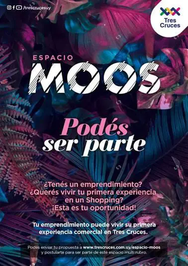 Si tenés un emprendimiento constituido y buscás una oportunidad que te ayude a potenciar la notoriedad de tu negocio, Espacio Moos es para vos. Para inscribirte ingresa en https://www.google.com/url?q=http://www.trescruces.com.uy/espacio-moos&source=gmail&ust=1658328261257000&usg=AOvVaw1Ya7w59HljGq5e-nOzHAb0">www.trescruces.com.uy/espacio-moos completa los datos, adjunta información sobre tu emprendimiento, fotos de los productos, un detalle de precios, y un video breve explicando porque crees que deberías participar de la experiencia shopping de Espacio Moos. Por más información puedes comunicarte a [email protected].